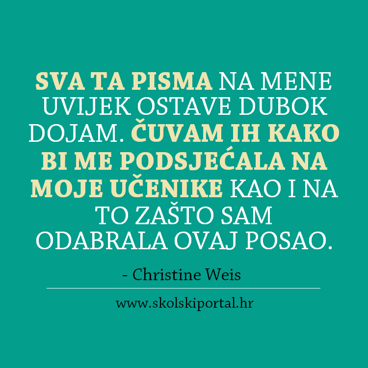 Sva ta pisma na mene uvijek ostave dubok dojam. Čuvam ih kako bi me podsjećala na moje učenike kao i na to zašto sam odabrala ovaj posao. Ona su za mene vrijedna riznica sjećanja na sve moje učenike koje sam imala prigodu poučavati tijekom godina.