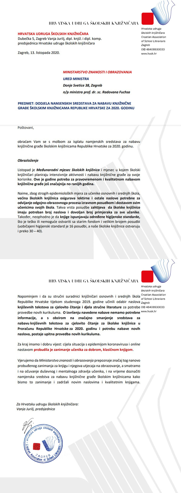Dopis je samo jedan dokumentirani oblik cijelog niza aktivnosti koje Hrvatska udruga školskih knjižničara poduzima s ciljem osiguranja dostatne i kvalitetne nabave knjižnične građe školskim knjižnicama Republike Hrvatske.