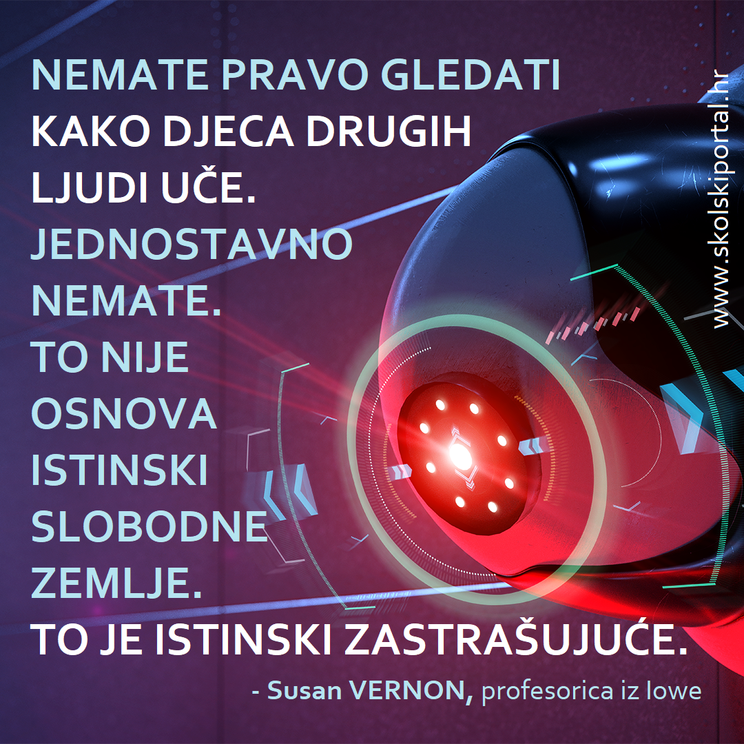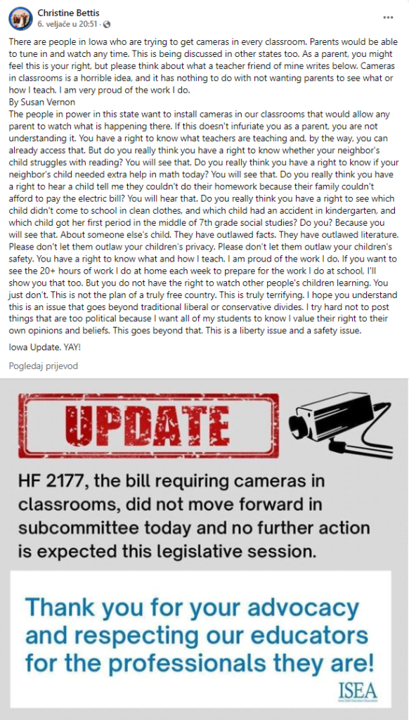 Reakcija profesorice Susan Vernon iz Iowe s razlozima zašto kamere ne smiju biti dio učioničke svakidašnjice pronijela se društvenim mrežama, a objavljena je i u članku Teacher’s Response to Iowa’s Cameras in the Classroom Bill Goes Viral na obrazovnome portalu WeAreTeachers.