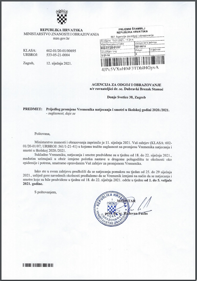 Početak provedbe natjecanja i smotri u školskoj godini 2020./2021. je 1. veljače 2021. godine.