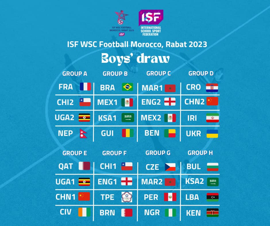 Hrvatski školski sportski savez sudjelovat će na Svjetskom školskom prvenstvu u nogometu koje se održava u Rabatu, u Maroku do 31. srpnja 2023. godine. ISF World School Football Championship organizira Svjetska školska sportska federacija, a Hrvatsku će predstavljati ekipa mladića iz Druge gimnazije Varaždin.