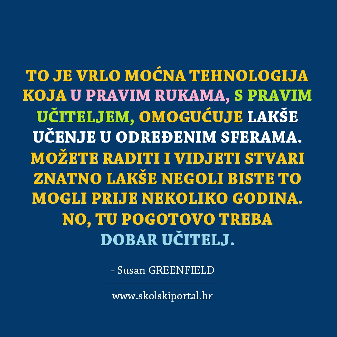 Poznata britanska neurologinja Susan Greenfield prije nekoliko godina za vrijeme posjeta Zagrebu izjavila je: „Ako učeniku date iPad, ne ćete mu time odmah uručiti i uvid, razumijevanje, kreativnost. Ne daje vam tehnologija automatski i vještine. S druge strane, to je vrlo moćna tehnologija koja u pravim rukama, s pravim učiteljem omogućuje lakše učenje u određenim sferama. Možete raditi i vidjeti stvari znatno lakše negoli biste to mogli prije nekoliko godina. No, tu pogotovo treba dobar učitelj.”