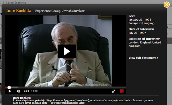 Dostupna su svjedočanstva s područja Hrvatske. Recimo, kod primjera pretraživanja riječi “Croatia” izlistana su 31 videoisječka, 81 enciklopedijski unos i 26 fotografija. Arhiv “Vizualna povijest” sadrži 395 svjedočanstva svjedoka na hrvatskom jeziku. Nekoliko hrvatskih učitelja pripremilo je pod vodstvom više savjetnice Lorande Miletić tijekom 2006. godine nastavne materijale na hrvatskom jeziku: