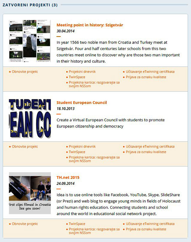 eTwinning projekte možemo koristiti u redovnoj te u izbornoj i fakultativnoj nastavi. To mogu biti projekti vrlo ograničene, male i vremenski kratke tematike, a mogu biti i višemjesečni ili cjelogodišnji. Može sudjelovati nekoliko učenika, razred i cijela škola. Za početak je vjerojatno bolje odabrati manje projekte. Tu nudim vrlo konkretnu ideju kolegama povjesničarima. Ideja je kreirati projekte pod nazivom „Meeting point in history: xyz“. Jednostavno pronađite događaje u povijesti gdje se susreću (dodiruju) najmanje dva naroda ili države. Na eTwinning live portalu objavite natječaj za projekt i čekajte da vam se jave zainteresirani kolege ili krenite aktivno pretražujući potencijalne partnere.