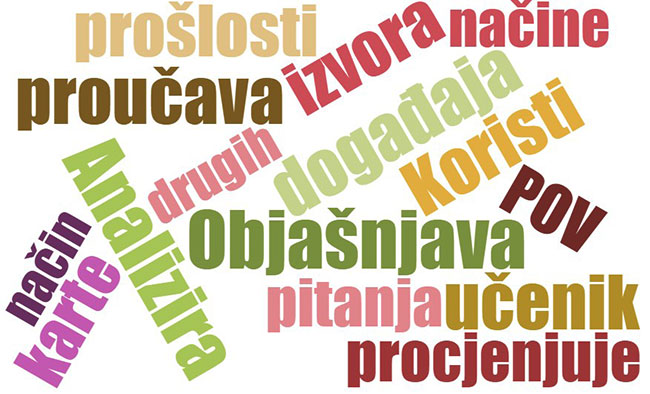 Sljedeći je primjer oblaka najčešćih riječi u prijedlogu kurikuluma povijesti koji uključuje sve ishode i njihovu razradu: