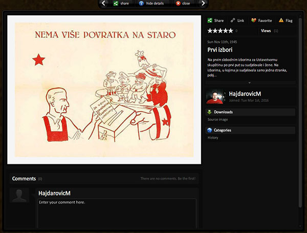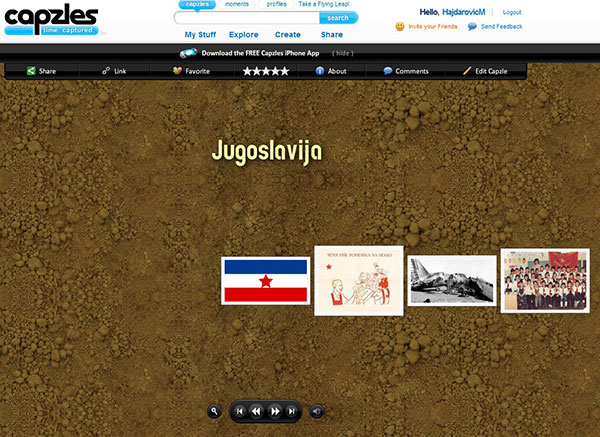 Nakon poduljeg traženja aplikacije koja stvarno radi ukazao se Capzles, koji radi upravo ono što i tražimo. Možemo kreirati vremensku lentu na koju dodajemo događaje. Pri tome dodajemo naslov, objašnjenje, grafički prilog, vremensku odrednicu uz opcijske dodatne postavke. Valjda napomenuti da postoje problemi s aplikacijom ako je koristite u internetskom pregledniku Chrome. Događaji na lenti mogu se dijeliti na društvenim mrežama, komentirati i ocjenjivati. Dobra strana ove aplikacije je mogućnost podizanja i korištenja vlastitih fotografija s računala. Primjeri kako izgleda vremenska lenta i detalji jednog događaja: