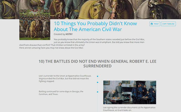 Možete dodati tekst, grafiku, video, audio, pitanja višestrukog izbora, povuci i potegni, forum za raspravu ili dodatni podnaslov u samoj lenti (tako može imati dodatne tematske podjele). Učenici mogu aktivno raditi na lentama koje izradi učitelj, a mogu ih praviti i samostalno. Besplatan učiteljski račun može prihvatiti do 200 učenika koje možete podijeliti po grupama/razredima. Učenici nemaju ograničenje po broju kreiranih lenti. Želite li uključiti više od 200 učenika, cijena je 49 $ godišnje. Učenici mogu komentirati već postojeću lentu i njene dijelove. Učitelj nadzire i upravlja komentarima. Dodatni plus za ovu aplikaciju je mogućnost printanja lente vremena. Primjer početka lente: