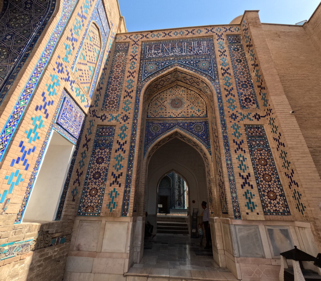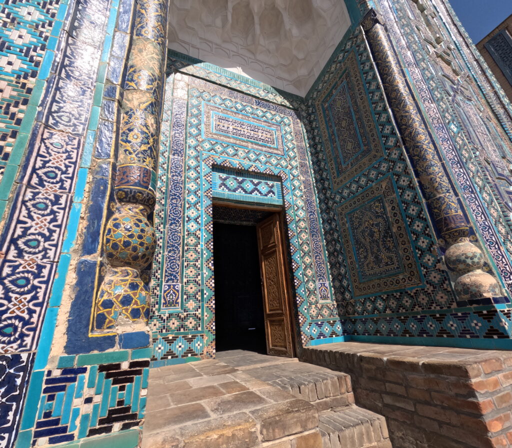 Galerija se završava okruglim dvorištem pod svodom. Ispod njega, s desne strane, nalaze se drevna ukrašena vrata koja vode do glavnog svetišta – Mauzoleja Kusama ibn Abbasa. Teško je riječima i slikama dočarati divotu koju pruža Shakhi Zinda.