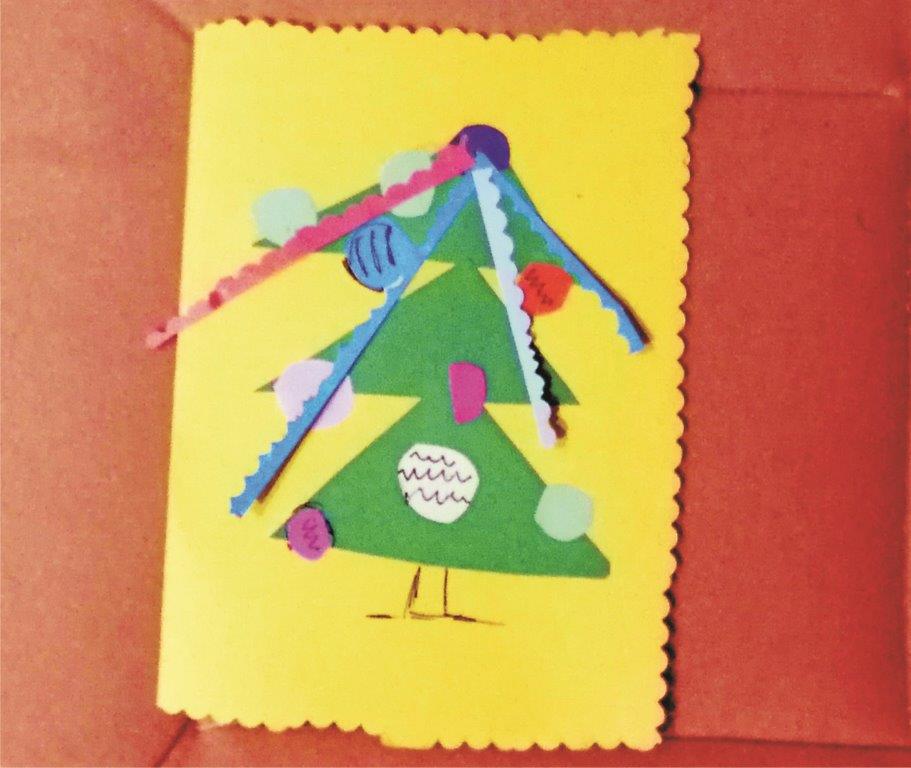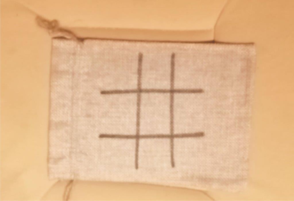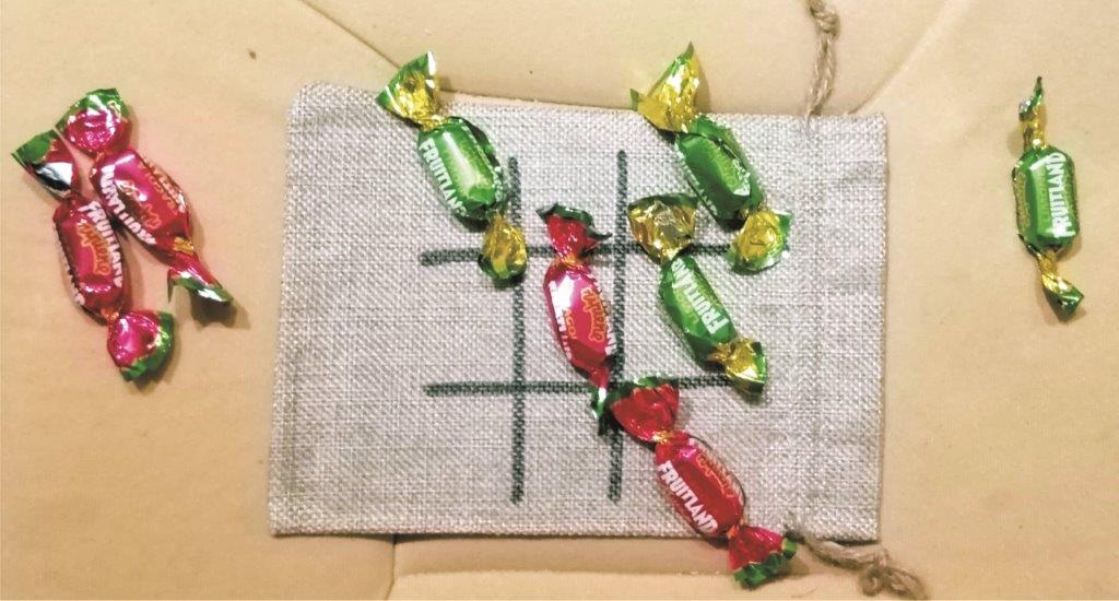 Na jutenu vrećicu nacrtala sam ljestve za igru križić-kružić, a u vrećicu stavila jednak broj zelenih i crvenih bombona. Zatim sam svakom učeniku napisala božićnu čestitku, adresirala koverte i pripremila sve za poštu.