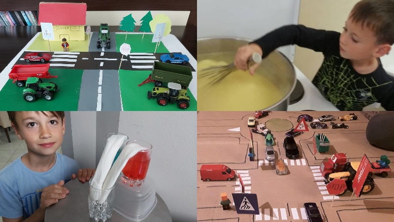 Nakon usvajanja prometnih znakova,učenici su dobili zadatak da pokušaju sami napraviti prometnicu i prometne znakove. U svojim igračkama pronašli su različite figure i prometna sredstva [prometala]. Prometne znakove napravili su od materijala koje su imali u svojem domu. Koliko su bili kreativni, pokazuju i fotografije njihovih prometnica. Na kraju su se poigrali sa svojim ukućanima i na taj način ponovili sve što smo dotad naučili.