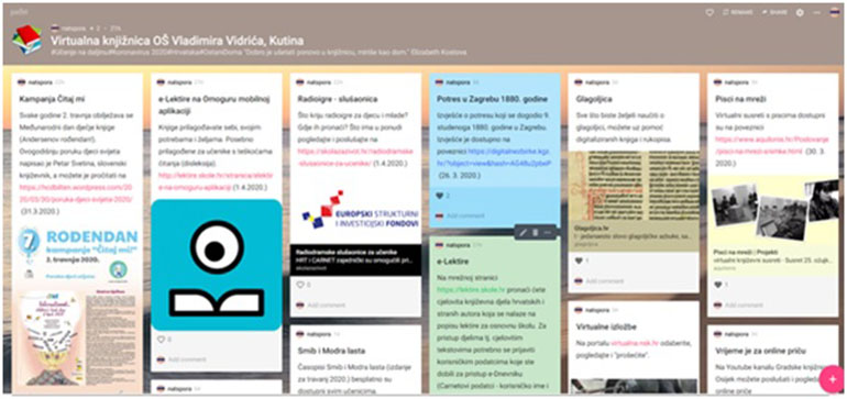 Stručna suradnica školska knjižničarka smislila je virtualnu knjižnicu koristeći se digitalnim alatom Padlet, a knjižnica je zamišljena kao interaktivna ploča koju mogu uređivati i njezini korisnici. Krajnji cilj je osigurati dostupnost izvora znanja u digitalnom obliku poštujući autorska prava, omogućiti pravo na čitanje i slobodan pristup informacijama te biti potpora učenju na daljinu.