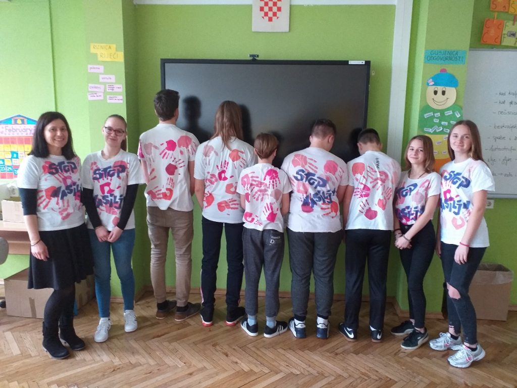 Učiteljica prirode i biologije Sandra Cvetić, u suradnji s učiteljem likovne kulture, osmislila je i provela projekt na satu razrednika s učenicima 8.b razreda. Jednobojne majice bijele ili neke druge boje učenici su oslikali otiscima ruku, s porukom STOP NASILJU!.