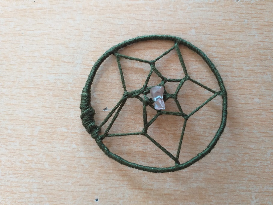 3. Konac iste ili drugačije boje (prema želji) uvedemo u iglu i pletemo „paukovu mrežu“ unutar kruga, dodajući perlice po želji.