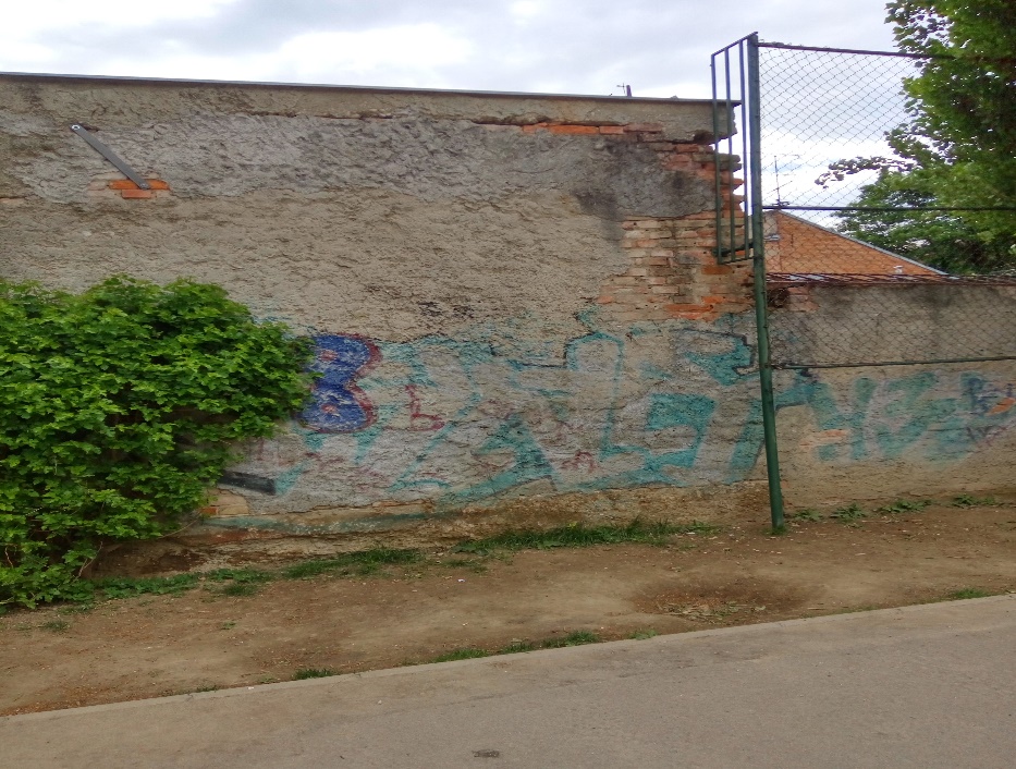 ZONA B – između žičane ograde i zida parkirališta (oko jablana) Trenutačno zapušteni zidovi oslikani dječjim crtežima i zbijena zemlja gotovo bez raslinja oko stabala.