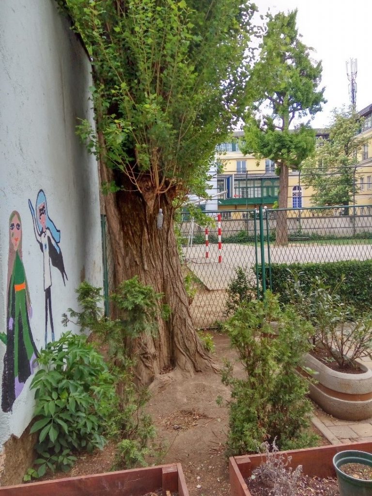 ZONA A – istočni dio dvorišta (između spremišta i zida parkirališta). Trenutačno zapušteni zidovi oslikani dječjim crtežima i zbijena zemlja bez raslinja oko stabala.