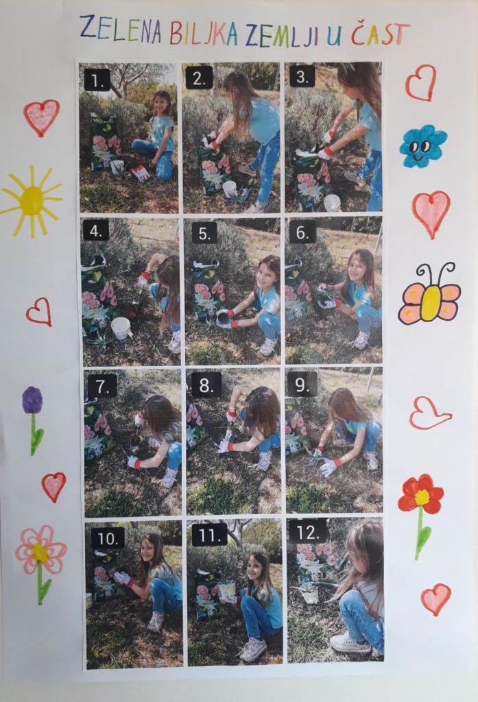 Izradom plakata „Zelena biljka Zemlji u čast“ učenica 1. b razreda obilježila je Dan planeta Zemlje. Učenica je dokumentirala s pomoću 12 fotografija sve korake sadnje biljke Aloa Arborescens.