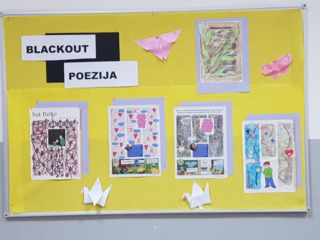 U sklopu projekta „Ispiši stranice koje pomiču granice“ izrađen je razredni kutak za čitanje u prvom polugodištu. Učenici su se upoznali s blackout poezijom.