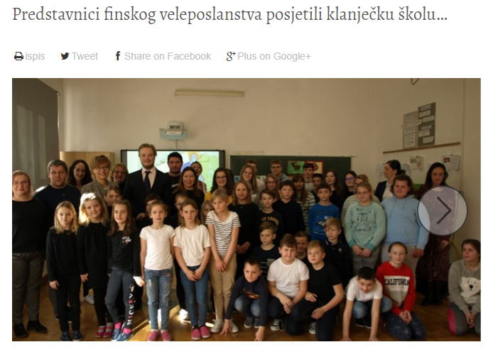 Slikovnica je, uz igrokaz, pjesme, ples i recitacije na finskom jeziku, predstavljena prigodom posjeta školi predstavnika finskog veleposlanstva. Projekt je vodila učiteljica Mira Petek.