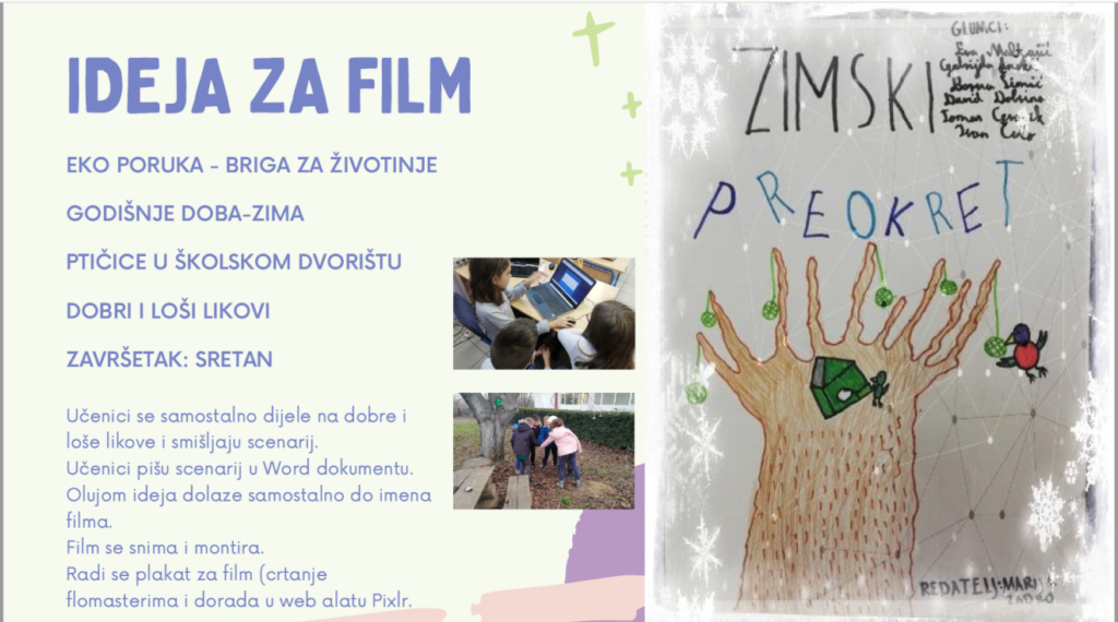 Učenici 4. a razreda ovog su prosinca čitali lektirno djelo „Duh u močvari“, potaknuti na to miniplakatom o Kopačkom ritu. S pomoću različitih zadataka u obradi lektire (pantomima likova, ispravi pobrkane dijelove slikovnice i ispričaj priču, radni listići zabavnih zadataka) uspjeli su potpuno doživjeti lektirno djelo te bili spremni na gledanje filma, uočavajući razliku između njih. Nakon odgledanog filma učenici su snimili vlastiti film prema uzoru na ovo djelo, a izradili su i plakat uz njega. Učenici su u ovom projektu otkrili kako se književni tekst adaptira u film, a kako i jedno i drugo postaje poticaj njima za stvaranje nekih novih priča i novih filmova.