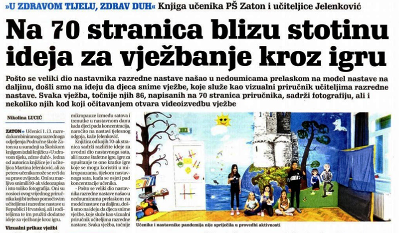 Učenici 1. i 3. razreda kombiniranoga razrednoga odjeljenja Područne škole Zaton su u suradnji sa Školskom knjigom izdali knjižicu »U zdravom tijelu, zdrav duh!«. Jedna od autorica knjižice je i učiteljica Martina Jelenković, ali za petero učenika može se reći da su prave zvijezde. Oni su marljivo snimili 90-ak videozapisa i isto toliko fotografija.