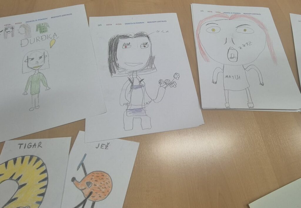 ♦  Slijedi likovna aktivnost „Jaga iz mog filma“ u kojoj učenici crtaju lik Babe Jage prema nasumično izvučenim opisima iz košarica (oči, usta, kosa, odjeća ili pokrov, rekviziti). Tako nastaju vrlo različiti, maštoviti prikazi Jage, kojima učenici mogu dati i vlastito ime. Svi se radovi izlažu na ploči i tako imamo našu malu izložbu.