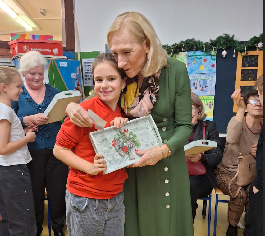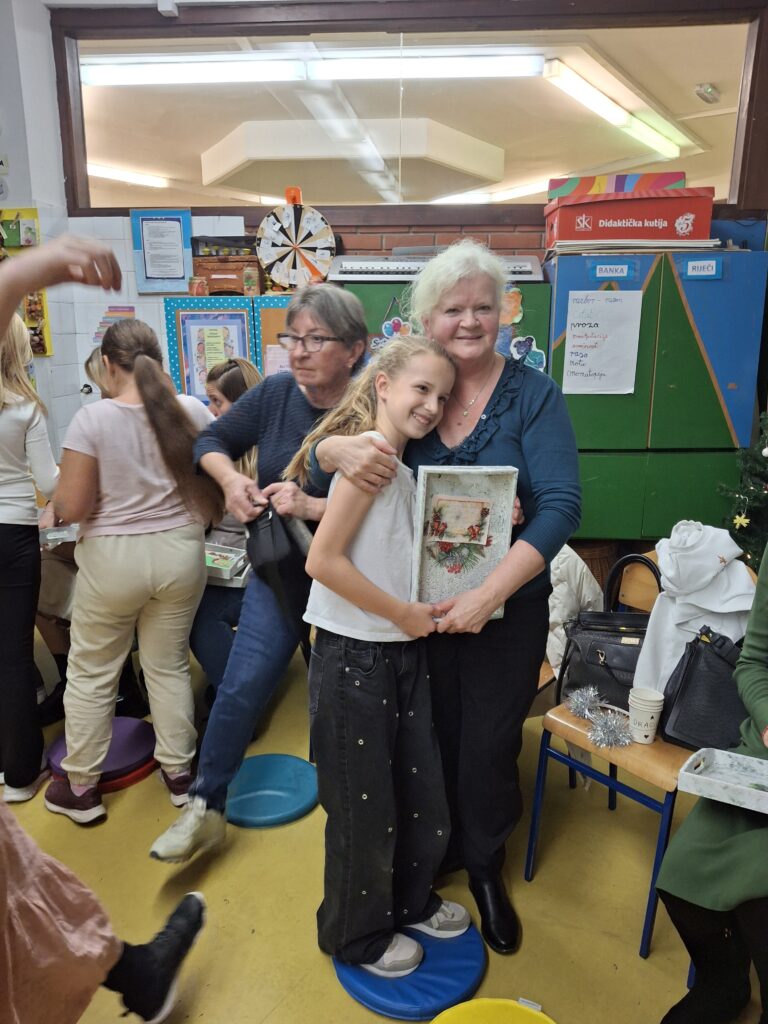 Saznali smo i zanimljivost – jedna je baka glumila u dječjem igranom filmu Vlak u snijegu pa si je od honorara platila vozački ispit. Poveo se zanimljiv razgovor o pitanju što bi djeca svojim bakama poklonili iz svog vremena, a što bi voljeli „posuditi˝ iz djetinjstva svojih baka. Moji su školarci poželjeli svojim bakama ustupiti školski autobus da ne pješače do škole, a iz doba bakinog djetinjstva uzela bi bezbrižnost igre, slobodu kretanja i boravak u prirodi. Otplesali smo svoje božićne koreografije, a zaplesale su i bake. Poklonili smo im podloške za kolače koje smo izradili i dali im pisma zahvale koja su bakama opet izmamile suze radosnice. Napominjem kako sve bake nisu uspjele doći. Dvjema učenicama, koje nemaju baku, došle su mame i prisjetile se svojih djetinjih priča.