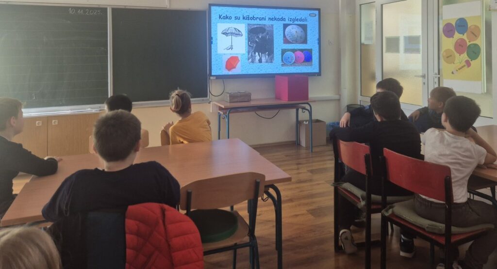 Učenici su aktivno sudjelovali na predavanju o povijesti kišobrana i pogledali bogatu multimedijsku prezentaciju. Naučili su da kišobran nije uvijek služio samo kao zaštita od kiše. Nekada je bio simbol statusa, ljepote i ceremonije.