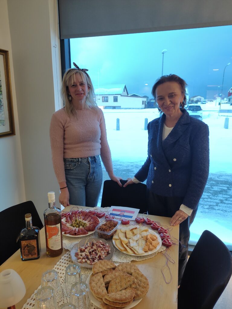 Tijekom ovakvih mobilnosti učitelja običaj je organizirati internacionalni doručak ili večeru. Mi smo organizirali internacionalnu večeru. Svaki je sudionik donio neke namirnice karakteristične za zemlju iz koje dolazi. Estonke su donijele tri vrste sira i sušenu janjetinu, Danci svoj poznati tamni kruh, namazan jetrenom paštetom i poslužen s ciklom na vrhu. Mi smo donijele fini dalmatinski pršut, paški sir, sir prgicu, čvarke, naše masline, rakiju bisku i pelinkovac antique.