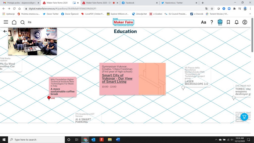 Gimnazija Vukovar prošle je godine predstavljala Republiku Hrvatsku pobjedničkim projektom donacijskog natječaja Hrvatskog Telekoma pod nazivom Generacija Next: Seismograph – Earthquake detector in real time, a s obzirom na to da su stekli brojna iskustva i znanja te pod dojmom energije grada Rima, i ove su se godine vukovarski gimnazijalci odvažili za ovaj pothvat. Ove godine u virtualnom izdanju predstavljamo projekt Emma koji je na INOVA MLADI 2020. ponio zlatnu medalju. Tijekom tri dana održavanja sajma od 11. do 13. prosinca 2020. vukovarski su gimnazijalci svaki dan bili dostupni brojnim posjetiteljima live streamingom. U sklopu jednog od glavnih kanala za live streamnig organizirano je 300 štandova raspoređenih u devet tematskih paviljona, od kojih je paviljon Educaton – Kids – Young Makers – Schools bio namijenjen školama. Gimnazija Vukovar bila je jedini sudionik iz Republike Hrvatske. Uz aktivni dio organizirano je 250 konferencija, radionica i edukacija za izlagače i posjetitelje. Fran Hutinec, Karlo Žutić, Ema Stankoski Hrgović i Lara Šijanović, učenici 1.c razreda prirodoslovno-matematičkog usmjerenja, odlično su se snašli u dualizmu između stvarnih i virtualnih dimenzija sudjelujući u trodimenzionalnom virtualnom svijetu, naseljenom avatarima i animiranim brojnim zbivanjima prihvaćajući novu normu interakcije. [za pristup je potreban unos i potvrda e-mail adrese]