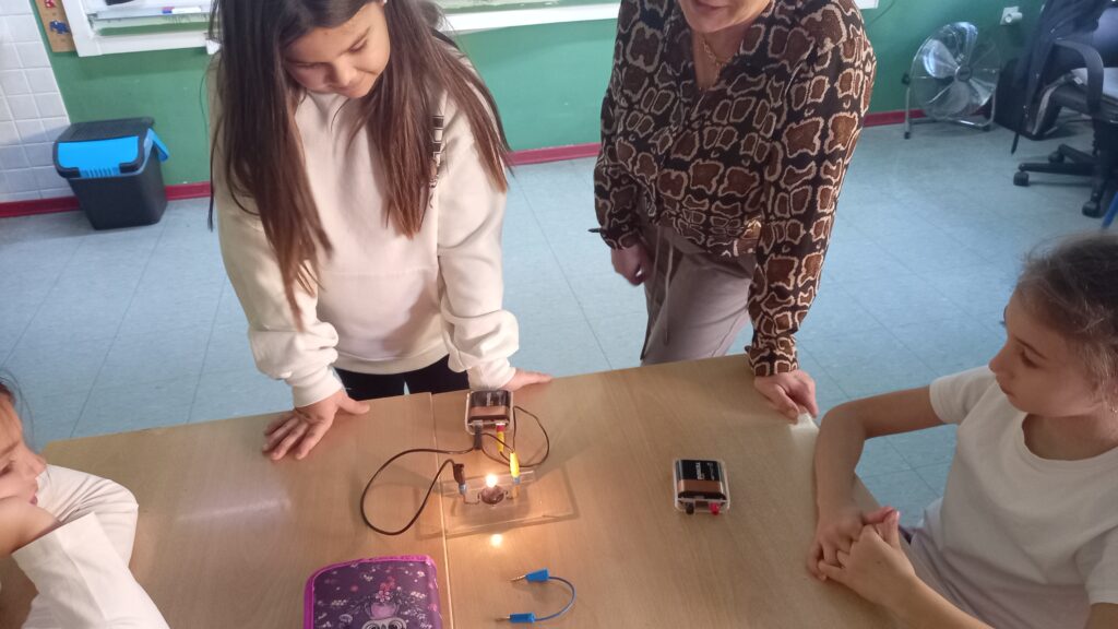 Zatim je u razred došla nastavnica fizike Heidi HEIL koja nam je pokazala kako nastaje struja. Učenici su samostalno spajali žice na različite načine i s radošću otkrivali da spajanjem žica na određeni način svijetli jedna ili više žarulja.