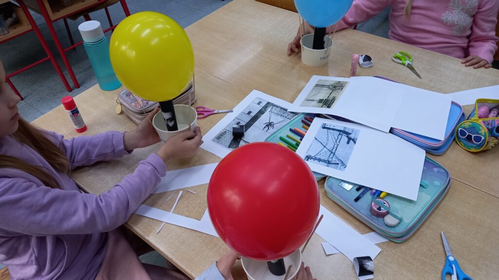 Učenici su izradili balone. Koristili su se recikliranim papirnatim čašama za sladoled, drvenim štapićima, toplim ljepilom i balonom.