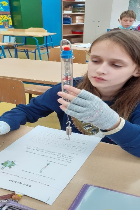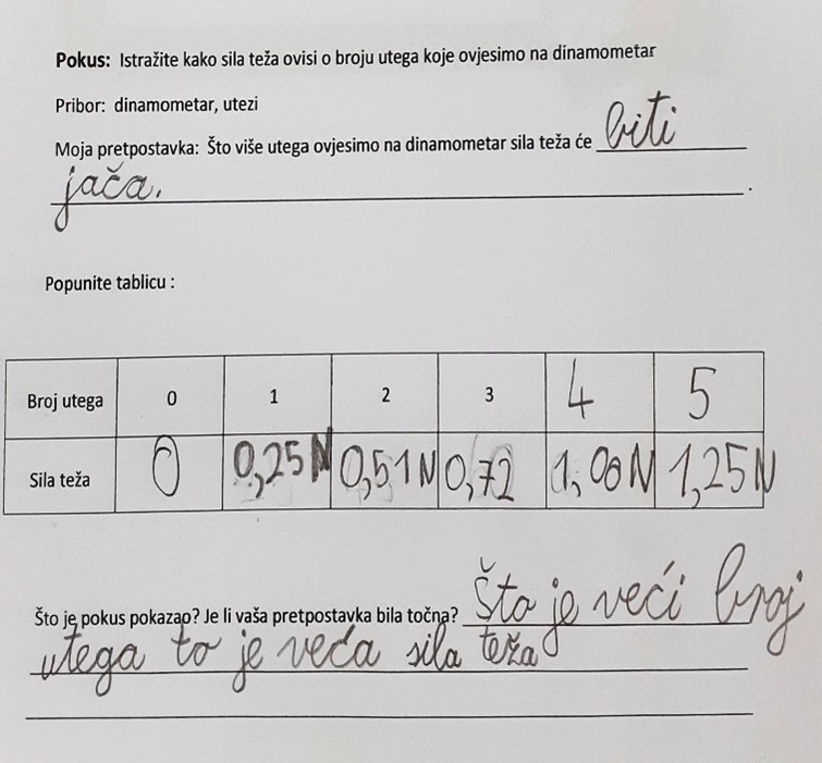 Učenici su zatim upoznali instrument za mjerenje sile – dinamometar i mjernu jedinicu za silu – njutn (N). U idućem su pokusu otkrili vezu između broja utega koje ovjesimo i sile koju očitamo s dinamometra. Učenicima smo dale kratke upute za izradu pokusa iz kojih doznaju što treba raditi, ali smo im ostavile slobodu da sami odluče kako će provoditi pokus. Svaki, pa i najjednostavniji pokus, važan je spoznajni pomak koji pomaže učenicima shvatiti neki pojam ili zakon.