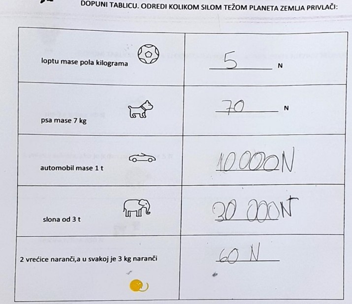 Uočavali su da loptica pada „prema dolje˝. Kada su na globusu pogledali što znači „prema dolje˝ za učenika u Hrvatskoj ili za onog u Australiji, shvatili su da se treba preciznije izražavati. Zaključili su da je sila teža sila kojom planet Zemlja privlači sve stvari prema svom središtu.