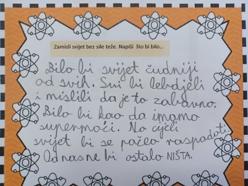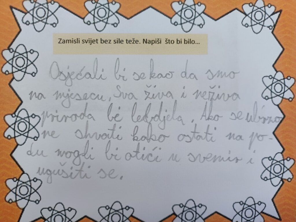Nezaobilazna aktivnost u Galović Sveznadar radionicama jest i poticanje kreativnog mišljenja, stoga uvijek postoji zadatak vezan uz zamišljanje i razmišljanje Što ako?. Na ovoj su radionici učenici zamišljali i zapisivali kakav bi život bio na planetu bez sila teže.