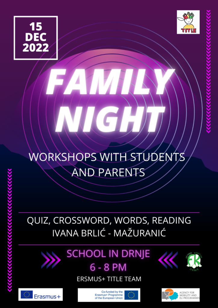 U našoj smo školi, u Drnju održali večer druženja s roditeljima i učenicima. Sudjelovali su učenici Erasmus+ tima TITLE i Erasmus akreditacije, njihovi roditelji te članice Eramus+ tima TITLE. Večer nazvana Family Night osmišljena je od šest različitih aktivnosti.