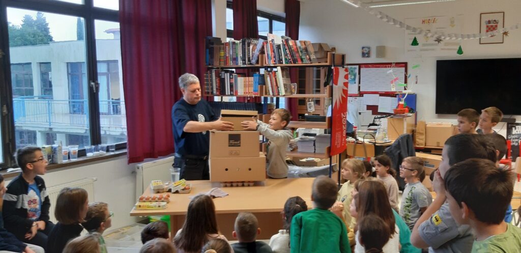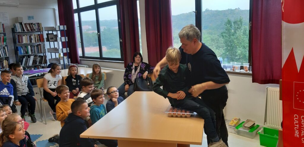 Najzanimljiviji je dio radionice bilo „sjedenje“ na jajima. Čanić je 30-ak jaja podjednake veličine najprije opteretio teretom od nekoliko natovarenih kutija, a nakon što ih je uklonio, na ravnu je podlogu na njih položio i jednog učenika, dragovoljca, nakon čega je utvrđeno da (ako su jaja jednake veličine i nijedno „ne strši“) – sva jaja „prežive“ bez ikakvih posljedica!