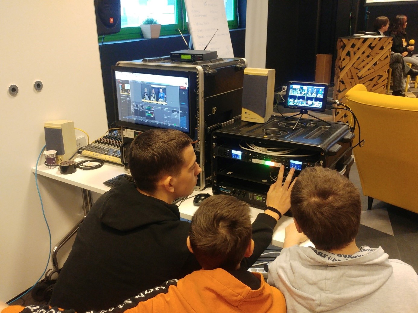 Slijedio je praktičan dio radionice medijske pismenosti i komunikacijskih vještina pod naslovom MALA PODCAST (RED)AKCIJA unutar koje su voditelji radionice s učenicima u trima zasebnim skupinama obrađivali sadržaje pojedinih segmenata produkcije podcasta: novinarski/voditeljski (Juliette Janušić, SVIMA i Goran Pirš Piro, Radio 808), tehnički (Gordan Antić, Radio 808) te glazbeni (Emir Bešić, Radio 808).