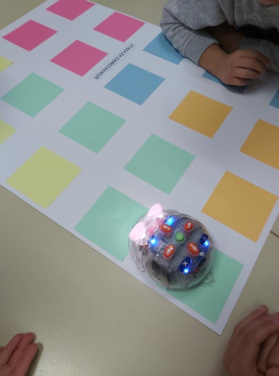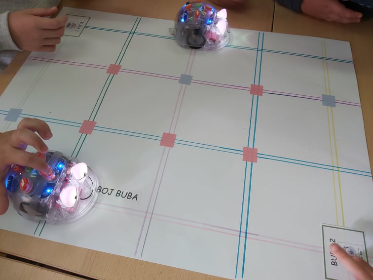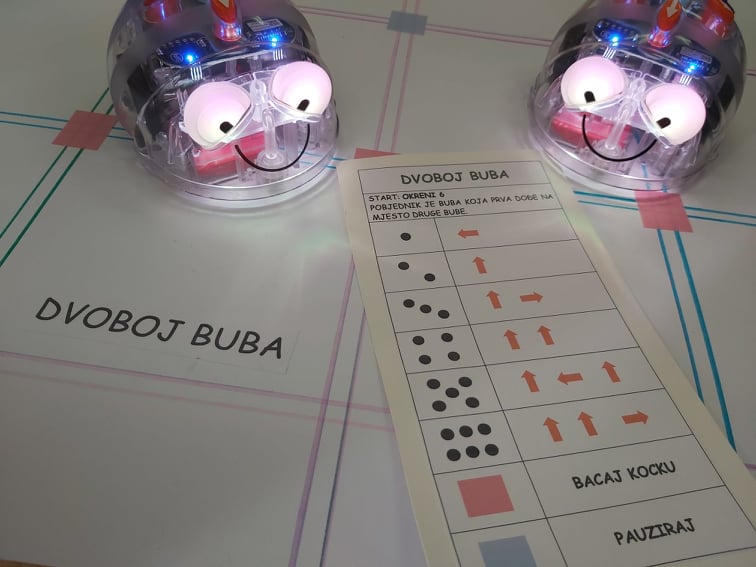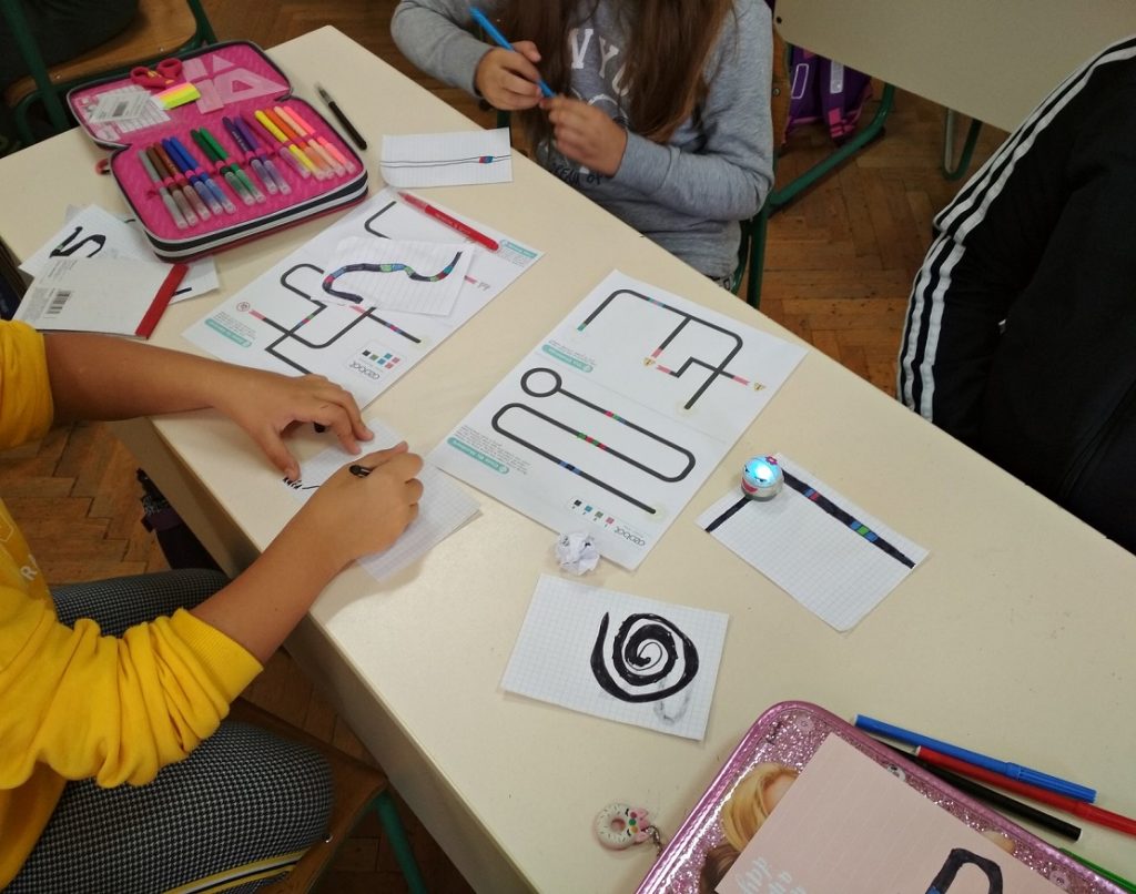 ♦♦ Učiteljica Maja Hižman učenike prvog razreda upoznala je s BlueBotima. Izradila je posebnu stazu za zagrijavanje na kojoj su učenici vježbali osnovne korake. Kreirala je mozgalicu spajanja parova kojom je htjela pokazati kako se nastava informatike programiranjem može povezati s hrvatskim jezikom i matematikom. Posebnu je pažnju dobila društvena igra „Dvoboj buba“ u kojoj je cilj bacanjem kocke i prateći upute zamijeniti mjesta BlueBotova. U drugom su razredu učenici koristili Ozobotove i crtali nedovršene staze dok su treći i četvrti izradili svoju prvu igru u Scratchu.