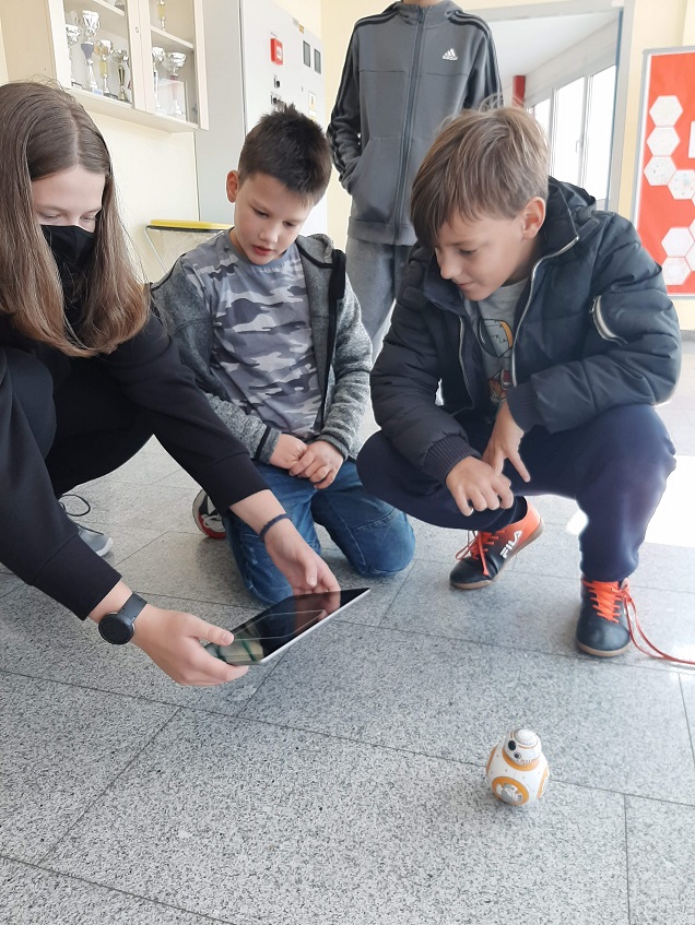 Učenice 8. razreda Jana, Klara i Sara upoznale su nas s mogućnostima robota BB-8 iz kolekcije Star Wars. Od djevojaka smo saznali da je maleni Droid zapravo prvi robot koji je nastao suradnjom Spheroa i Star Warsa. BB-8 se povezuje s mobilnim uređajem ili iPadom preko Bluethootha. Učenice su nam pokazale kako upravljati BB-om 8 uz pomoć joysticka, glasovnih naredbi te kako programirati naredbe koje će BB-8 izvršiti.