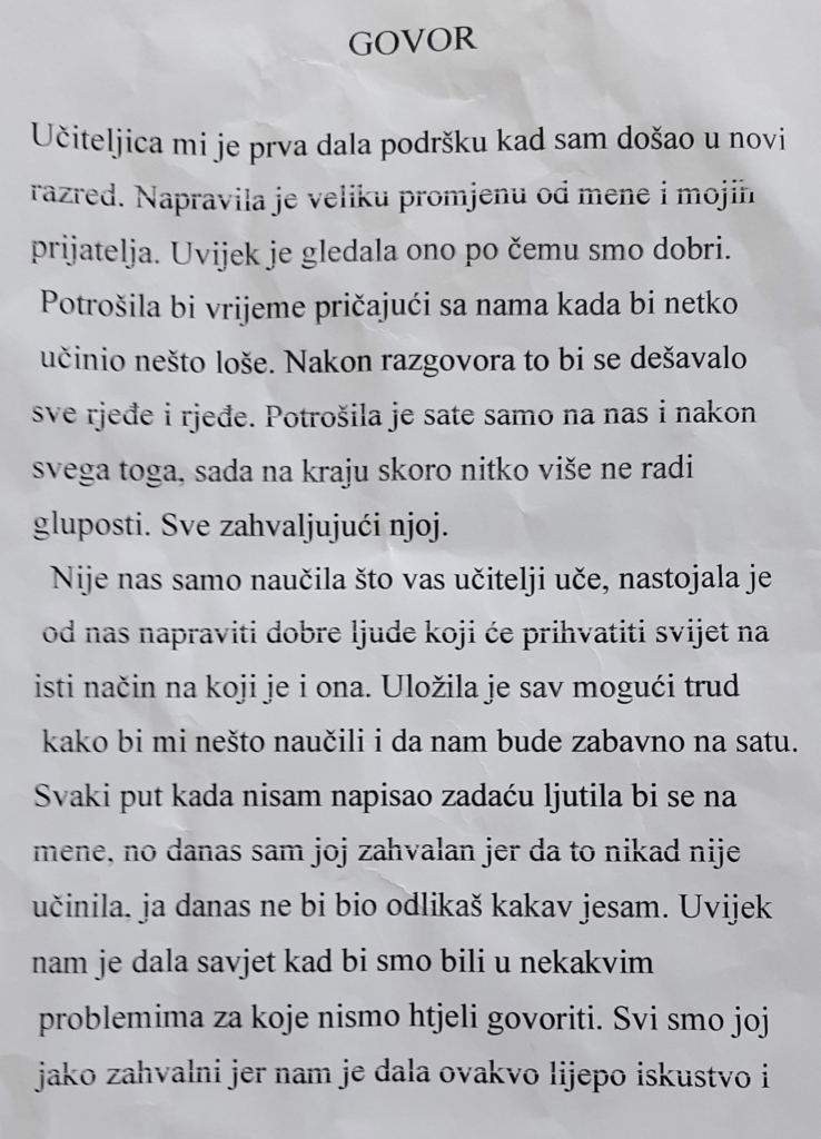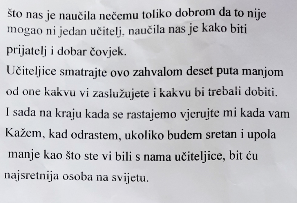I na kraju, sve one priče o učiteljima koje čujemo u parku ili na plaži: „Lako je vama učiteljima, radite samo četiri sata dnevno, cijelo ljeto uživate na moru i za ono koliko radite, imate preveliku plaću.“ – neka nas ne bole jer samo mi i naši učenici znamo koliko radimo, koliko se dajemo i koliko je težak naš posao, ali NE ODUSTAJEMO. Naša plaća nije brojka na našoj platnoj listi, već emocije koje djeca prepoznaju i u konačnici nam na ovakav način vrate!