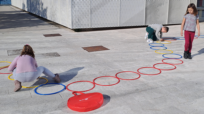 Na otvorenom polja na ploči predstavljaju obruči, a pijuni su učenici koji skaču u obruče i tako poboljšavaju koordinaciju i ravnotežu, ali i razvijaju naviku boravka i igre na svježem zraku.