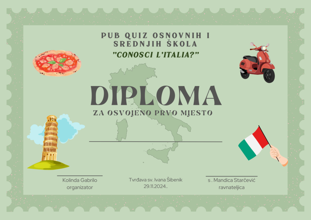 Potaknuta tim činjenicama – ja, učiteljica talijanskoga jezika Katoličke osnovne škole iz Šibenika, treću godinu zaredom organiziram kviz o poznavanju Italije s ciljem popularizacije i poticanja učenja talijanskoga jezika te promocije bogate talijanske kulture.