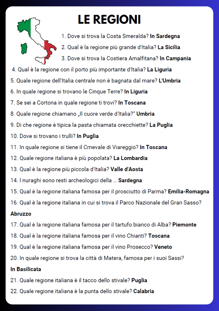 U prvom dijelu učenici odgovaraju na pitanja vezana uz talijansku povijest, geografiju, gastronomiju, umjetnost, modu, sport, film i tradiciju. Ovaj im dio omogućuje stjecanje dubljeg uvida u bogatu povijest i kulturnu baštinu Italije.
