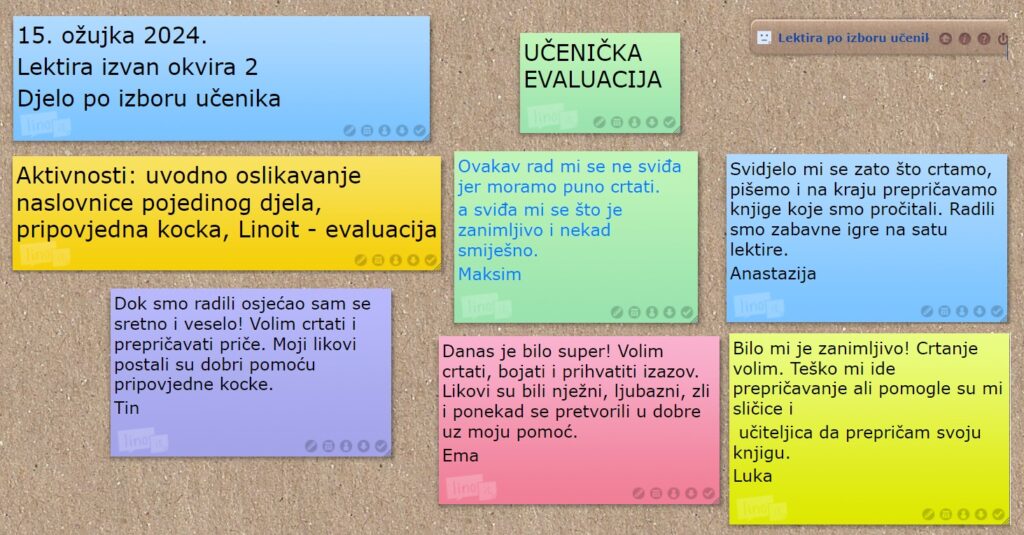 Tako su učenici likove obveznih književnih naslova upoznavali dizajniranjem naslovnica, u društvenim igrama, lektirama iz vrećice, putem prozorčića u likove, kocaka pričalica, tehnike kamišibaj, umne mape, izvanrednih vijesti, igre Escape room, digitalne slikovnice/priče (e-knjige), poezije zatamnjivanja, staze pripovijedanja, lektirnih ormara, reklama i razgovora s likovima.