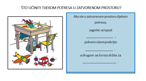 Naglasila bih iznimnu suradnju učenika u aktivnostima, posebno u aktivnostima vezanim uz potres i evakuaciju. Djeca odlično reagiraju, prihvaćaju nove informacije, prenose roditeljima što su naučili, čak ih i educiraju o pravilnosti pronalaska sigurnog mjesta prilikom potresa.