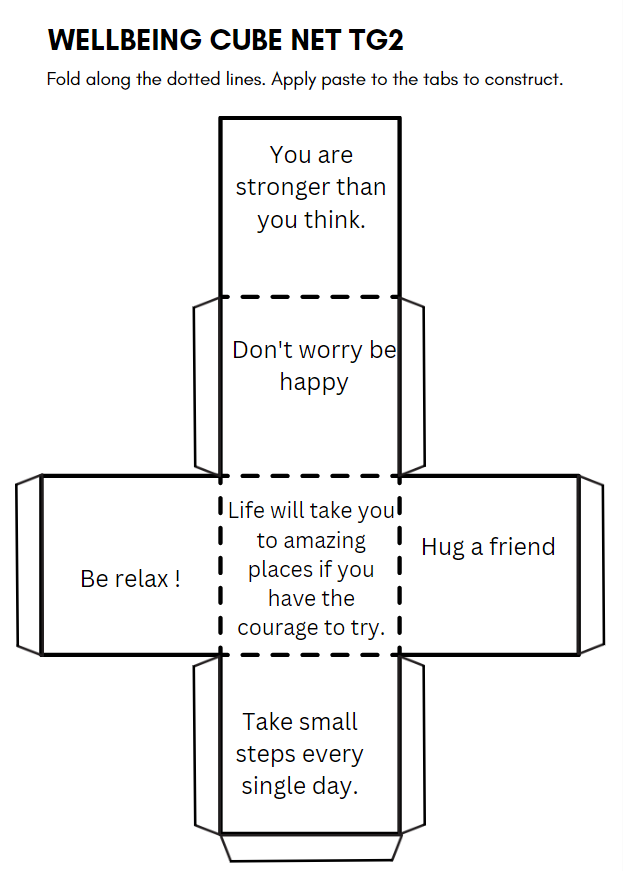 Aktivnost Dobrobit s tehnologijom omogućila je učenicima rad u transnacionalnim timovima na stvaranju kocki pozitive za dobrobit. Te su kocke bile ukrašene inspirativnim citatima, afirmacijama, simbolima sreće, mira, otpornosti te učeničkim crtežima. Kocke su simbolizirale osobne ciljeve i predstavljale dobrobit potičući tehnologijom međukulturalnu suradnju.
