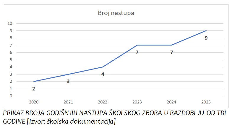 Školski zbor ima značajan status u kulturnom životu škole. Sudjeluje na obilježavanju važnih datuma: Dana škole, blagdana i državnih spomendana, a često nastupa i izvan škole, na manifestacijama lokalne zajednice.