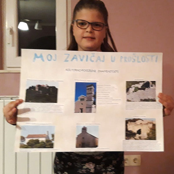 Danna JAKOVLJEV ✿ u svojem je plakatu prikazala i sve upoznala s većinom kulturno – povijesnih spomenika otoka Pašmana > Benediktinski samostan Sv. Kuzme i Damjana, crkvom Sv. Tome u Tkonu, Pustogradom, crkvom Gospe od Sedam Žalosti, crkvicom Sv. Antuna Pustinjaka te Ugrinića dvorima. Objasnila je  i procijenila povezanost baštine s identitetom zavičaja te ulogu baštine na zavičaj.