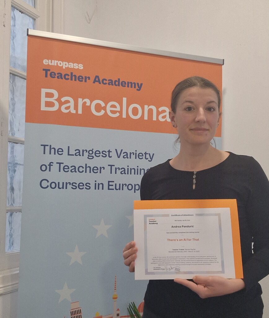 U Barceloni je održan Europassov (Europass Teacher Academy) tečaj „There is an AI for that” na kojem su sudjelovale još dvije kolegice iz Hrvatske te kolege iz Rumunjske, Poljske i Cipra. Cilj je tečaja bio upoznati sudionike s mogućnostima primjene umjetne inteligencije (AI) u obrazovanju.