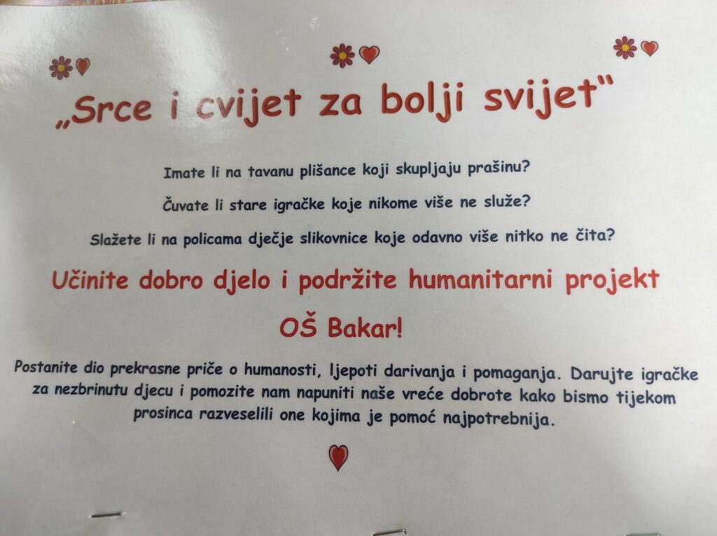 Potaknuti željom da pomognu, učenici OŠ Bakar organizirali su i bez imalo se oklijevanja uključili u tri humanitarne akcije: „Srce i cvijet za bolji svijet“, „Psiću pod bor“ i „Darivanje je radost“.